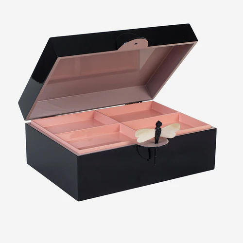Combinando tradición, funcionalidad y un diseño visualmente impactante, esta elegante Caja Decorativa Libélula es una pieza artesanal fabricada en Vietnam. Su meticuloso acabado con hasta 15 capas de laca sobre madera MDF resalta sus colores únicos por dentro y por fuera, mientras que la bandeja interior extraíble con compartimentos permite una organización práctica y cuidadosa.