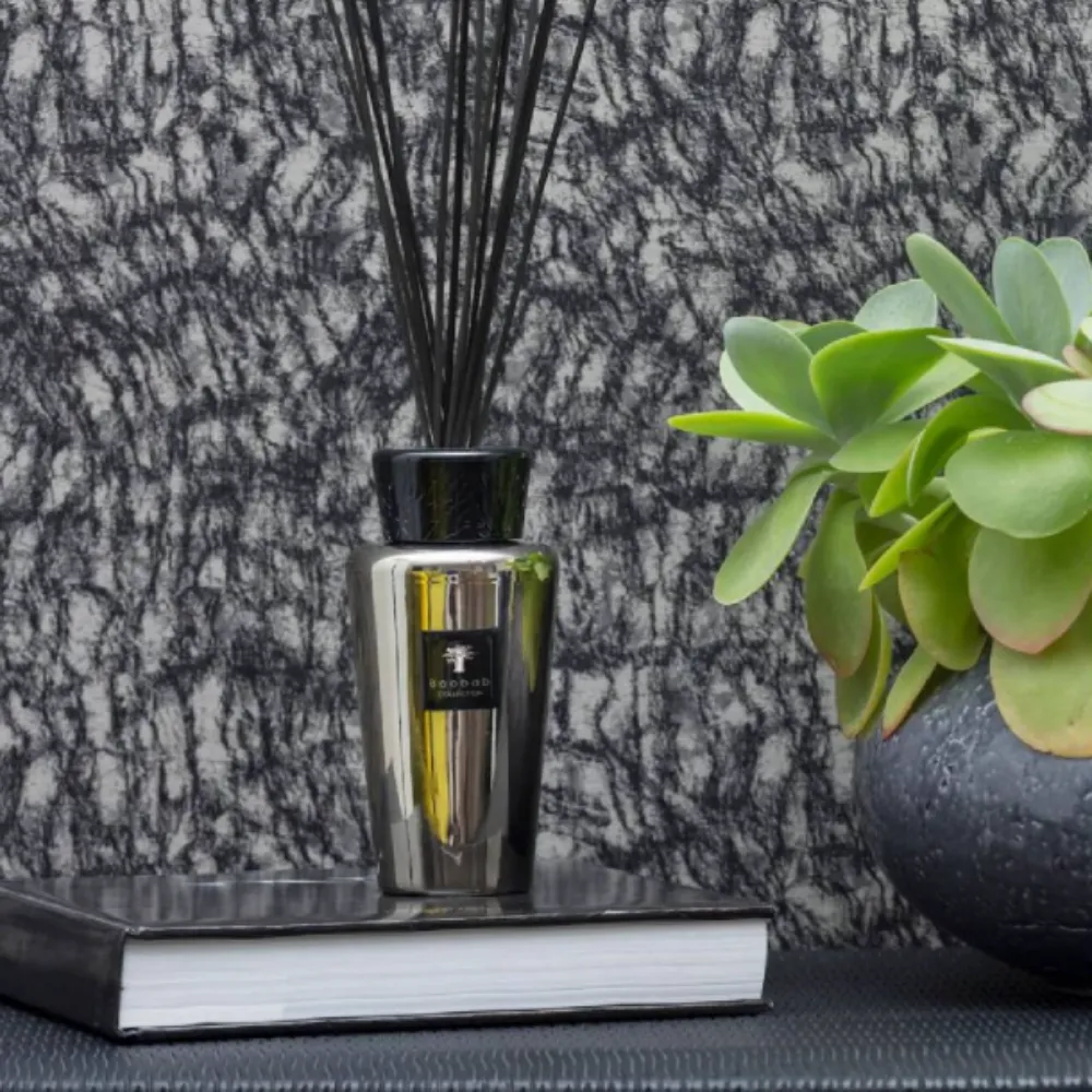 O difusor de fragrâncias Platinum é um frasco delicadamente revestido com uma tinta metálica que evoca o metal precioso que lhe dá nome. Com uma tampa de baquelite preta gravada com um motivo de raiz, este difusor de perfumes é um objeto verdadeiramente belo.
