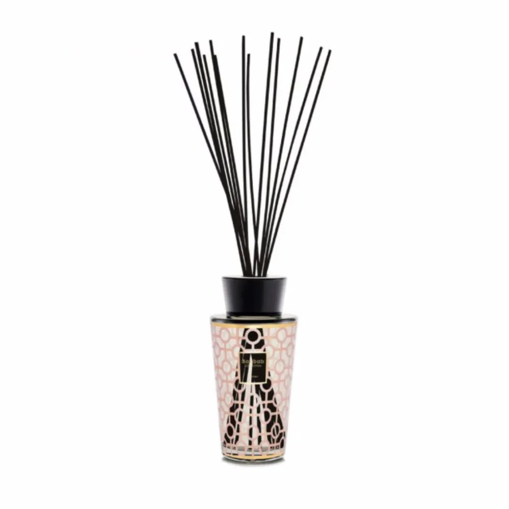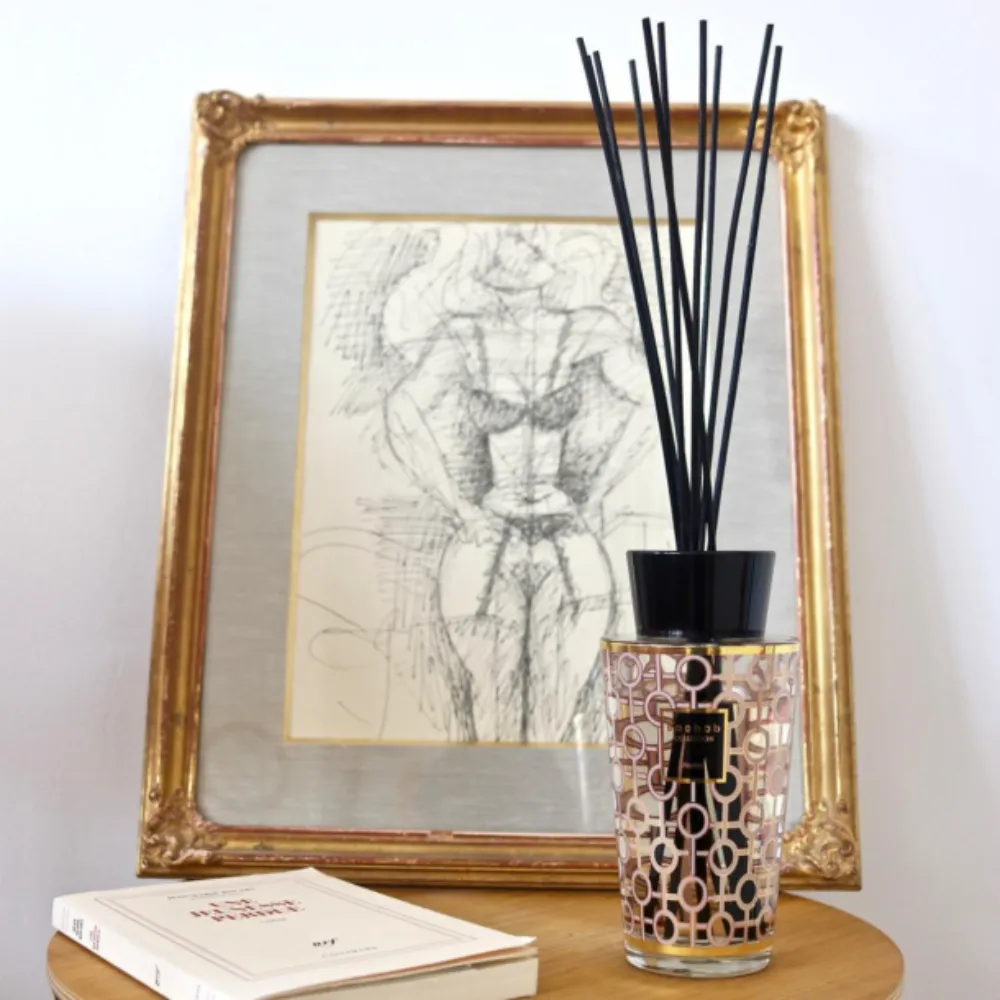 O difusor de fragrâncias para casa Women é decorado com uma elegante serigrafia em ouro 24 quilates e rosa claro, com um motivo que remete ao símbolo da feminilidade.