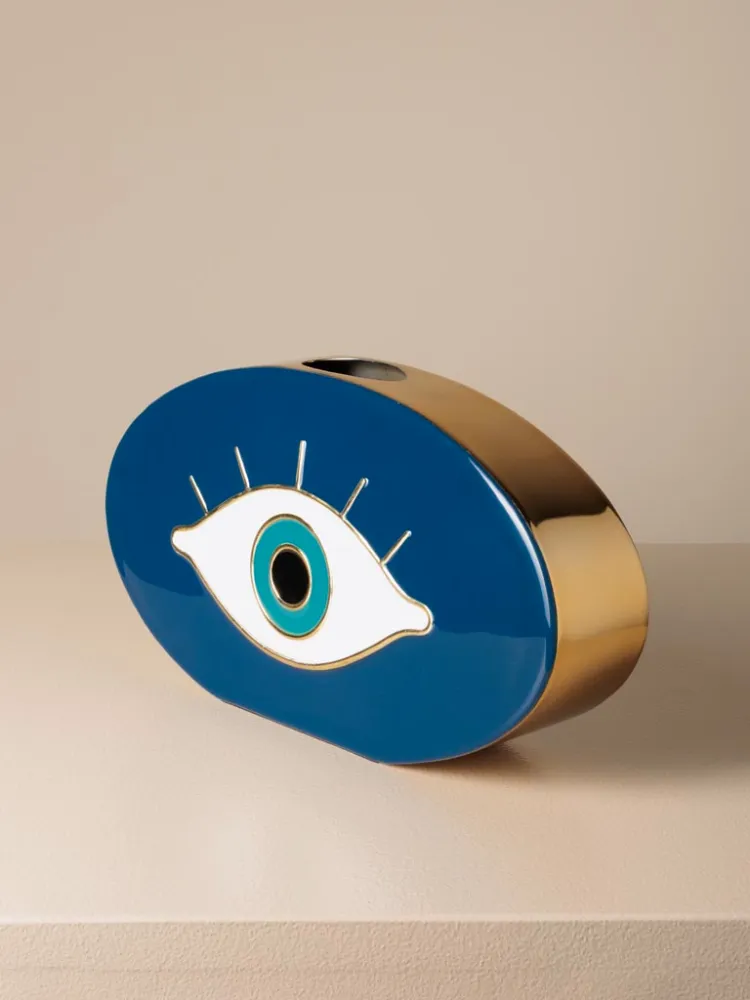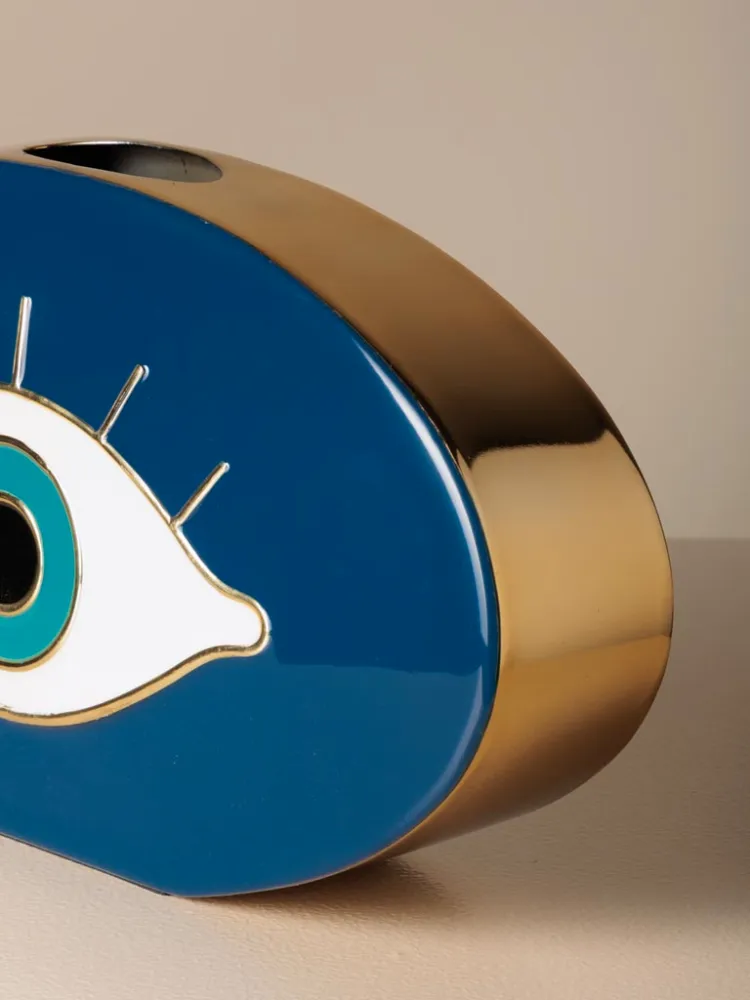 Este vaso decorativo azul se destaca por su diseño gráfico atrevido y contemporáneo. Perfecto como pieza central o elemento complementario, funciona tanto con flores como en exposición aislada.