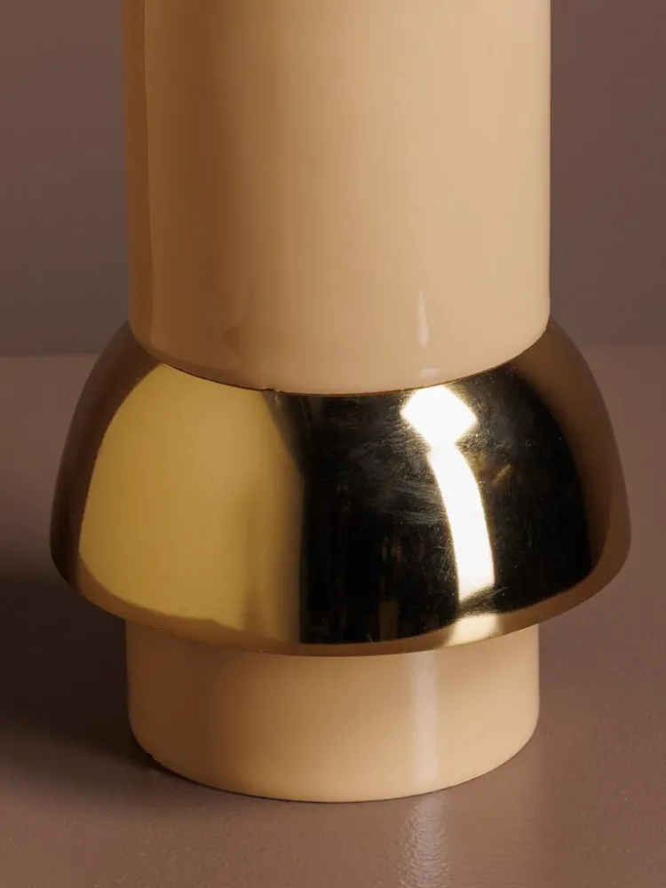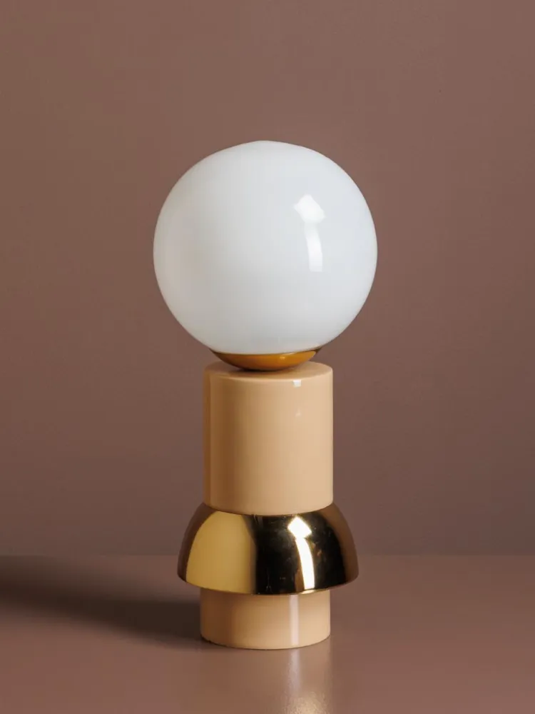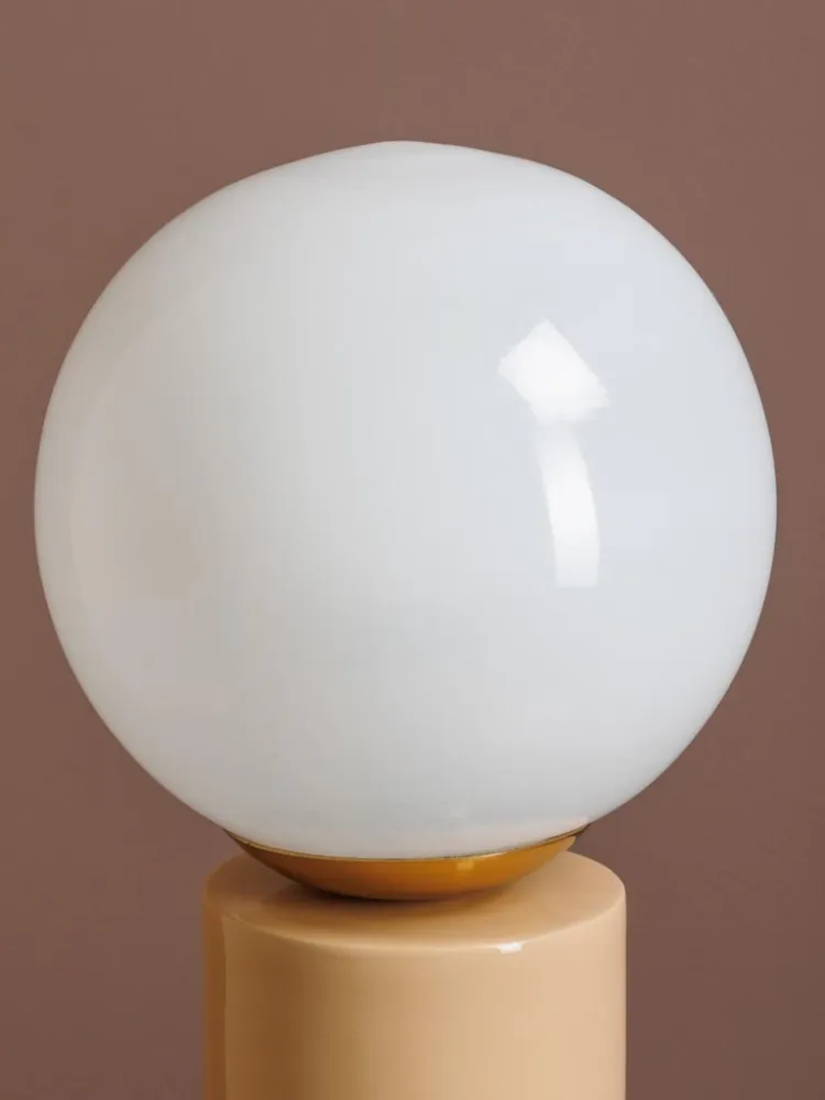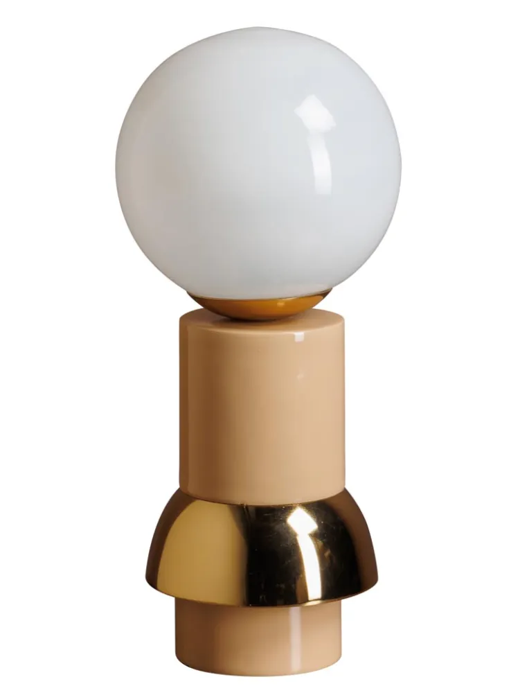 Lámpara minimalista con cuerpo cilíndrico en dorado mate y esfera opalina que difunde la luz uniformemente. Perfecta para ambientes sencillos y contemporáneos.