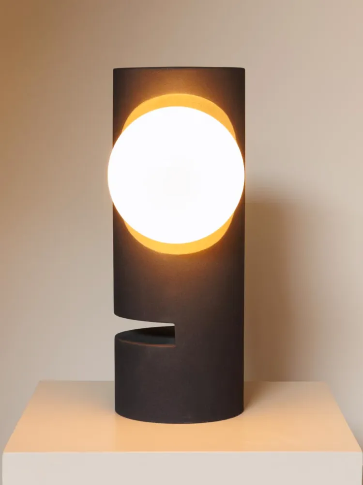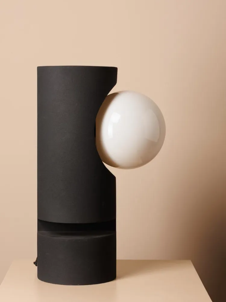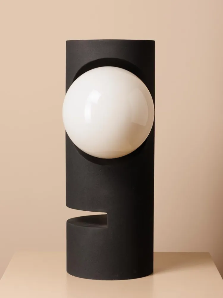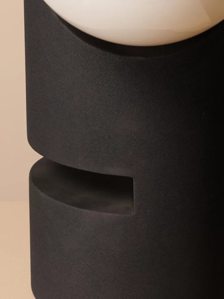 Lámpara minimalista con cuerpo cilíndrico en negro mate y esfera opalina que difunde la luz uniformemente. Perfecta para ambientes sencillos y contemporáneos.