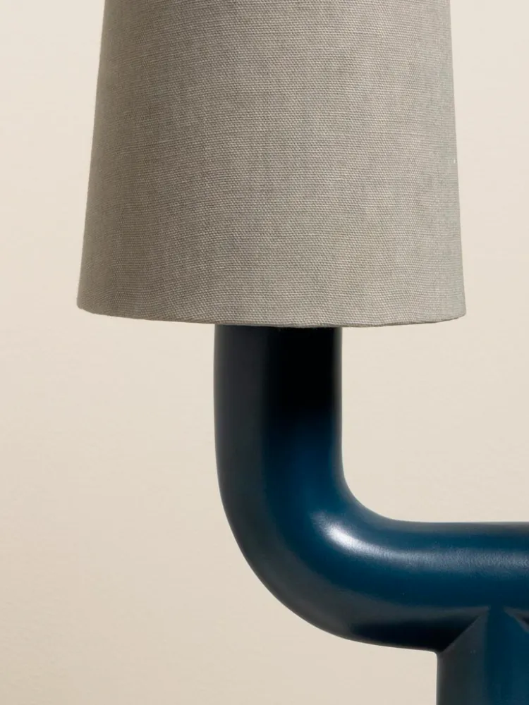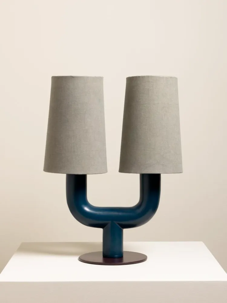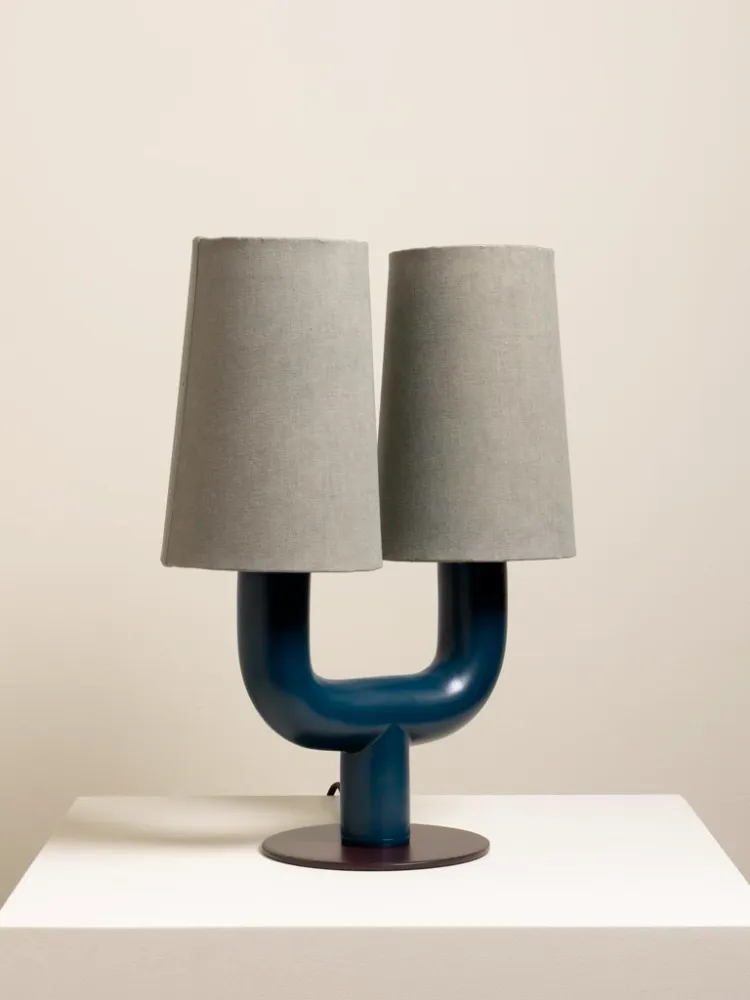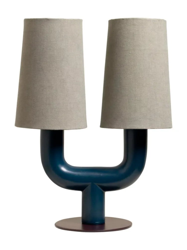Lámpara moderna con base en forma de U y dos pantallas de tela. La combinación de metal azul oscuro y tonos neutros crea un aspecto elegante. Ideal para iluminar salones, dormitorios u oficinas con una luz suave y acogedora.