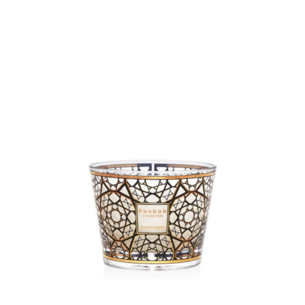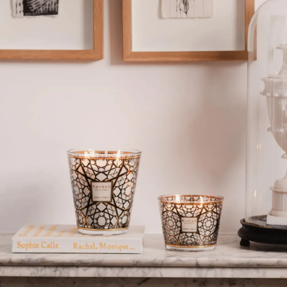 A vela perfumada Arabian Nights transporta-nos para o universo misterioso do Médio Oriente, através do vidro serigrafado com ouro de 24 quilates, inspirado nos delicados padrões vazados do moucharabieh da arquitetura árabe. A chama projeta sombras envolventes, enquanto a fragrância intensa de açafrão, oud e incenso convida a uma viagem imaginária pela terra das mil e uma noites.