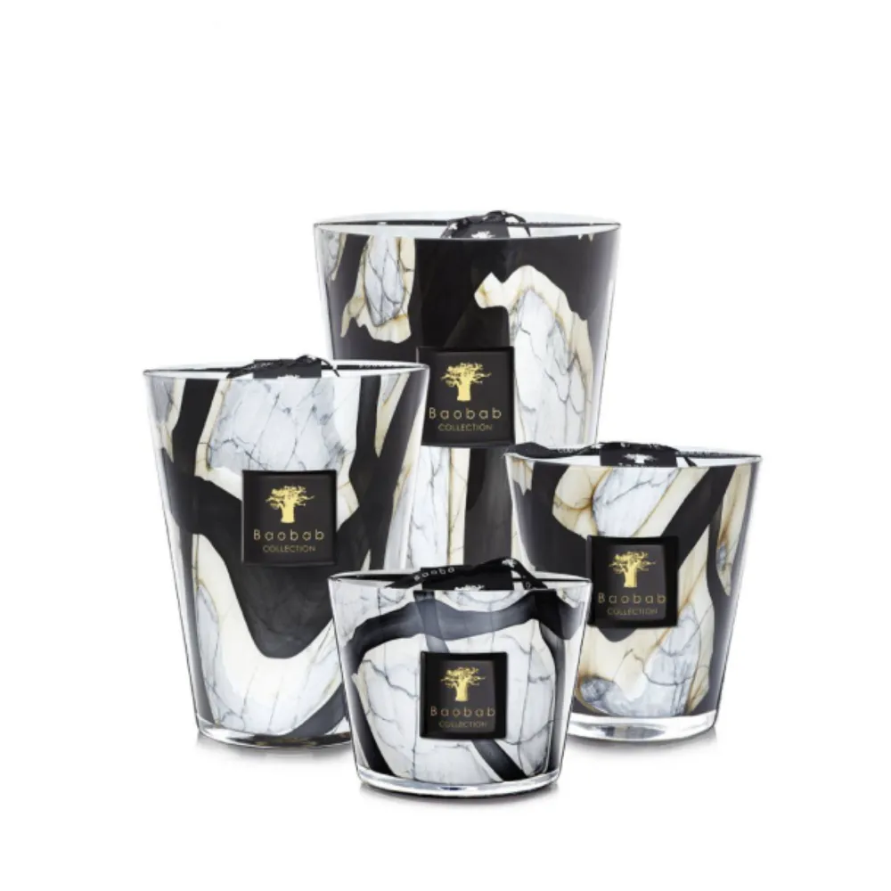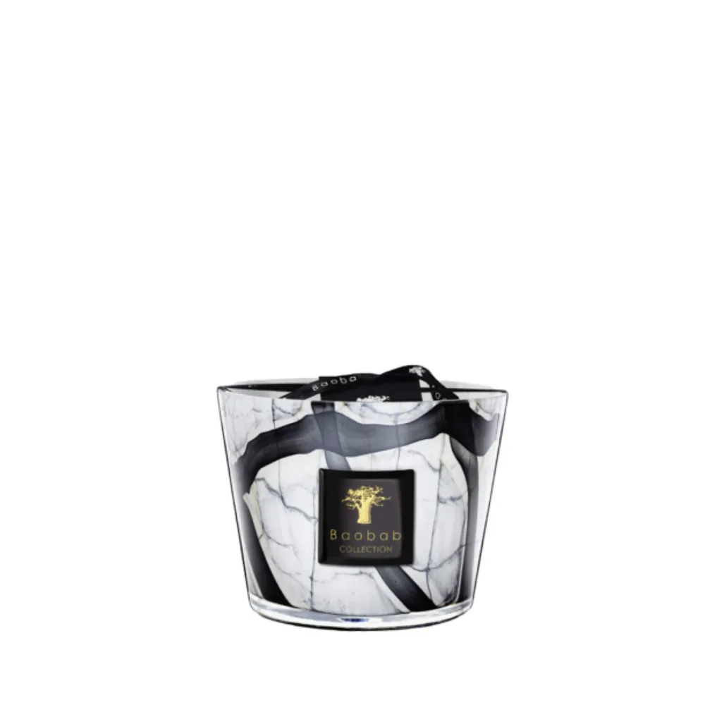 A vela perfumada está acondicionada num recipiente de vidro soprado artesanalmente, que reproduz mármore cinza com traços pretos e bordas bege. A elegância do vidro revela a chama, criando um efeito de pedra luminosa.