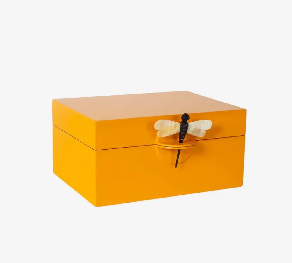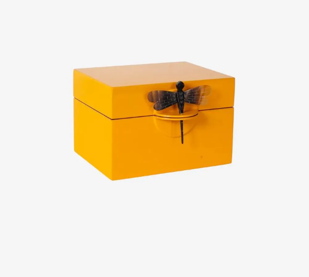 Combinando tradição, funcionalidade e um design visualmente marcante, esta elegante Caixa Decorativa Com Libélula é uma peça artesanal feita à mão no Vietname. O seu acabamento meticuloso com até 15 camadas de lacagem sobre madeira MDF, realça as suas cores únicas por dentro e por fora, enquanto a bandeja interior removível com compartimentos permite uma organização prática e cuidada.
