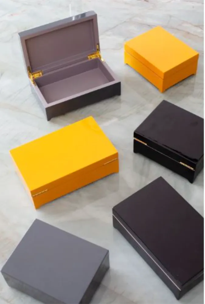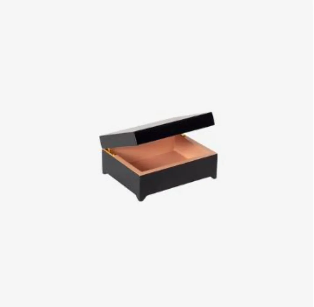 Caixa laqueada em MDF com 13 a 15 camadas de laca. 14 x 11 x 5,5 cm (altura).